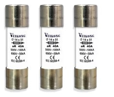 Juego de 3 Fusibles de Cartucho de Ceramica para Seccionador RT18-63, Tamaño 14X51 mm, Accion Rapida (aR) de 40 A, 100 KA para Variador: ACS180-04S-25A0-2, ACS180-04S-17A0-4, ACS355-03E-15A6-4