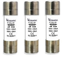Juego de 3 Fusibles de Cartucho de Ceramica para Seccionador RT18-63, Tamaño 14X51 mm, Accion Rapida (aR) de 63 A, 100 KA para Variador: ACS180-04S-033A-2, ACS180-04S-25A0-4, ACS355-03E-23A1-4
